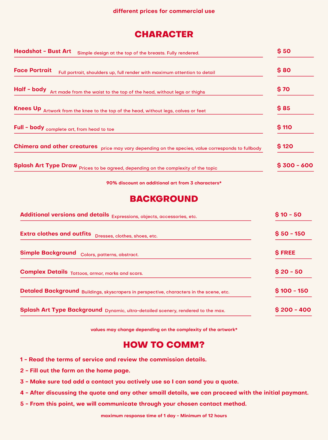 Hey there!Here’s the lowdown on my commission terms and how the artwork should be used. If we agreed on something specific in our initial chat, just stick with that, alright? These terms are here to keep things smooth for both of us. By accepting the commission, you’re confirming you’re cool with everything here.Let’s get to it: